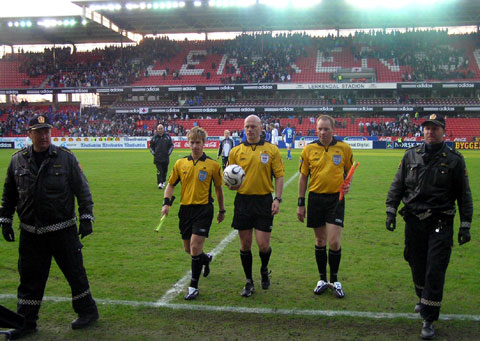 In the ninetythird minute of the game Christer Basma was fouled from behind by Thomas Mork close to Molde's goal. Instead of giving the home team a penalty kick, the referee chose to give a yellow card to the left back. Then the players, the substitutes, coaches and the crowd exploded with fury. The players argued with each other and the judge, while spectators threw red Coca cola balls onto the pitch. The game ended seven minutes into extra time.