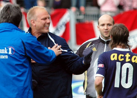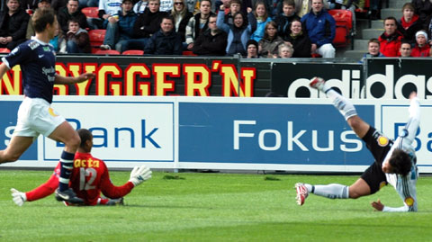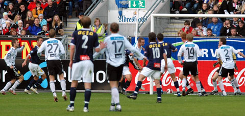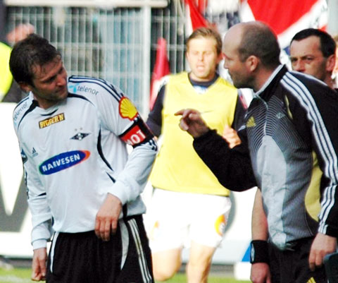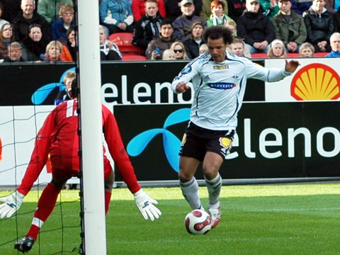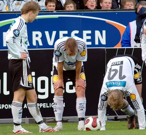 RBK maktet aldri å reise seg da gjestene snudde kampen. Her er bildene. Iversen stormer i angrep med Christer George som passiv tilskuer. Mens Hirschfeld ryddet opp bakerst. RBK tok ledelsen, da Braaten ble ulovlig stoppet av keeper Adam Larsen. Stormløp mot Godset-målet i begynnelsen av 2. omgang. Tettey var den som sløste bort de største sjansene, her i duell med George. I stedet kunne Stian Ohr (10) juble for sin utligning. Det ble enda verre da Ronny Deila sprang fra Kvarme i venstre bildekant, og satte inn 1-2. Sapara, Stoor og Iversen nede for telling. Tørum gir spillerne ordre om å angripe, uten at det funket. Dermed kunne Dag-Eilev Fagermo juble for den aller første seieren til Strømsgodset på Lerkendal.
