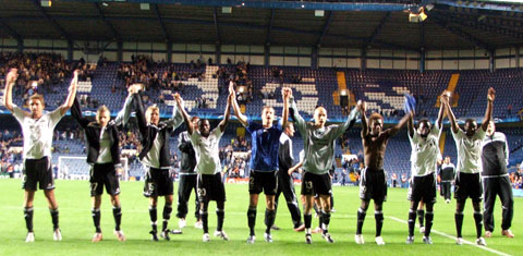 Harald Hardråde tapte slaget ved Stamford Bridge, mens Rosenborg vendte hjem fra toktet med æren i behold. Her er bildene fra 1-1-kampen mot Chelsea! RBK trakk ikke mer enn halvfullt stadion. Borteseksjonen var derimot godt stappet med rundt tusen til stede. Endelig er Strand og kompani tilbake i Champions League! De elleve utvalgte. Kapteinene John Terry og Strand. Kone tar avspark til Riseth. Traore med Joe Cole på slep. Dorsin blir stoppet. Chelsea kom til noen innlegg innledningsvis, men RBK ryddet opp. Bekymrede trenere. Dorsin får frispark. Koppinen i høyre bildekant lurer ballen forbi Terry. Petr Cech fikk ikke opp hendene i tide. Dermed kunne Koppinen og Sapara juble. Lagkameratene gratulerer. Tilbake for å forsvare ledelsen. Tallenes klare tale. Sjokkerte hjemmefans og japanske fotografer. Chelsea-avslutningene gikk for det meste til side for mål, og det ble mange utspark for Hirschfeld. Tettey prøver. Basma fikk en smell like før pause, og måtte ut. Sapara med et siste forsøk. Jubel ved pause: "Troillan på topp! Troillan på topp!" Absolutt et pauseresultat verdt å skrive hjem om. De første minuttene etter pause jaget RBK enda et mål. Tørum bivåner Traore. Dorsin og Traore kombinerte flere ganger på venstresida. I stedet utlignet Shevchenko. Strand fortviler. Kone sleit enormt med hodesterke Alex. Farlig Chelsea-frispark. Kone og Alex forbereder ny duell. Hirschfeld fortsatte å rydde opp. Cole og Essien på vei framover. Riseth fikk seg en smell. Strand jager et frispark fra Konan. Belletti skapte trøbbel. Alex vant igjen mot Kone. Essien i skuddet. Mourinho og Tørum maner fram sine lag. Kone med et siste forsøk framover. Fortvilelse på tribunene. En fin skalp i en trøblete sesong! Spillerne takker for god støtte. Jubel på tribunen. Jubel på banen. Fete glis.