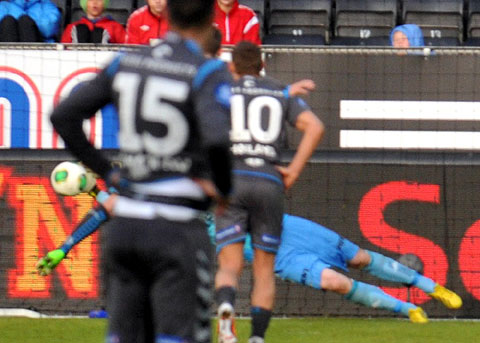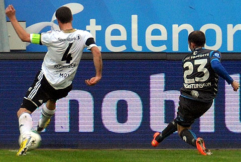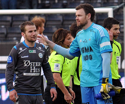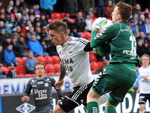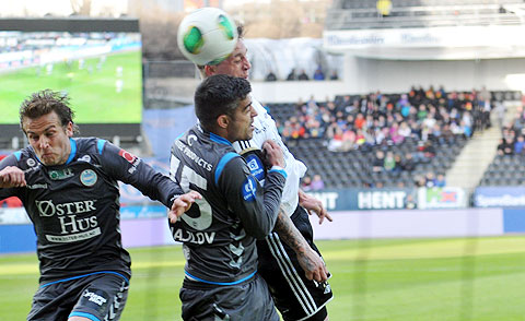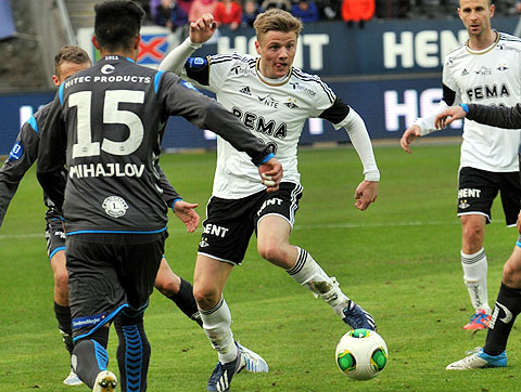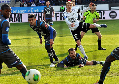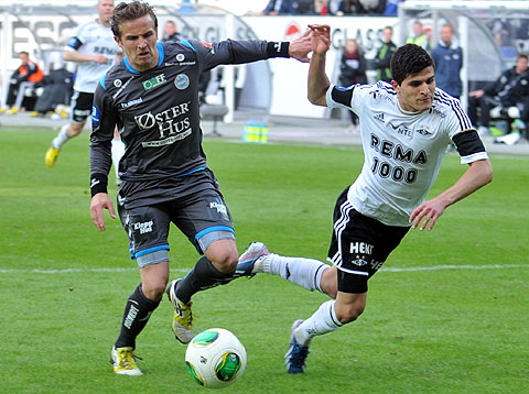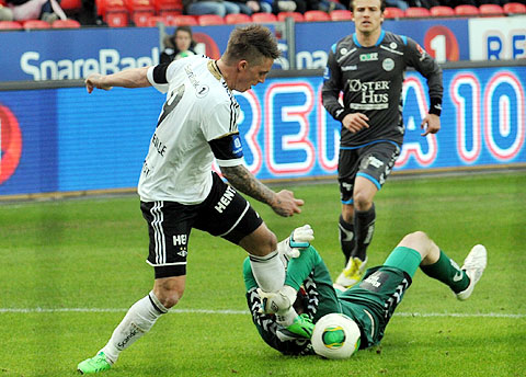 Rosenborg maktet ikke å snu den dårlige utviklinga på sesongen mot Sandnes Ulf. Se bildene fra 0-1-tapet. Hansen mot Høiland. Steinthor Thorsteinsson løp fra Reginiussen og scoret vinnermålet etter halvspilt 1. omgang. Dockal var tilbake på banen, og fyrte av noen skudd. Tore Hansen ga Bille gult kort like før pause for å ha hindret en motstander på midtbanen. Elyounoussi tok tak i 2. omgang ... ... og ville ha straffespark i duellen med Bjørnar Holmvik. Bille headet i lengste stolpe. Reginiussen hindret Fredrik Torsteinbø ... ... fikk straffespark i mot og direkte rødt kort. Hansen reddet forsøket fra Aksel Skjølsvik! Høiland vikarierte for Gamboa, som sonet karantene etter utvisninga i Haugesund. Midtsjø fikk et langt innhopp. Moe fikk et kort innhopp, og falt i sin første involvering i hjemmedebuten. Heldigvis ble det ikke mål i mot. Bille ble blåst av i duell med Sean McDermott ... ... ble holdt av Ulf-keeperen og kastet ballen i bakken. Gult kort for protesten. Og utvisning. Valgte å rive i filler trøya. Drepende blikk på benken. Skjølsvik og Hansen spilte mye sammen i Royal League høsten 2006.