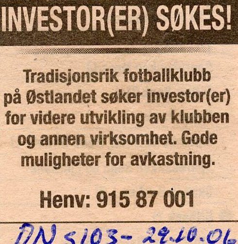 Annonsen var satt inn av den gamle "storklubben", Sarpsborg fotballklubb i Dagens Næringsliv i fjor høst, og sannelig har noen henvendt seg: