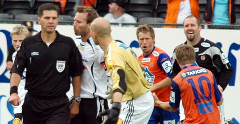 TWO FATES: While Lars Hirschfeld complains to Terje Hauge, colleague Adin Brown celebrates.