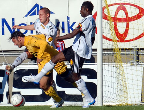 Rosenborg med ti mann måtte slite for å få med seg poeng mot Bodø/Glimt. Se bildene! Tradisjoner er til for å brytes? Traoré var vraket før VM-kvaliken, men gikk rett innpå laget etter landskampene. Allerede etter to minutter fikk Stoor gult kort fra Brage Sandmoen etter et veldig billig frispark til Trond Olsen. Thiago Martins brakk nesa, da både Stoor og Tettey uforskyldt sparket ham i ansiktet. Noen måneder i vinter var Derek og Miller lagkamerater. Iversen og RBK sleit med avslutningene. Tettey spilte halvannet år for Glimt som liten, men hadde aldri spilt RBK-kamp i Bodø før. Konan danket ut Koné fra start, og hadde noen gode forsøk. Like før pause fikk Stoor (skjult bak 9 Martins) rødt kort etter nok en løpsduell med Olsen. Martins vinner hodedullen med Lago. Og Demidov kan ikke forhindre at Thomas Rønning (29) bruker kneet for å få ballen i mål. Fire minutter senere rettet Demidov opp, da keeper Pavel Londak aldri fikk kontroll på heading fra Miller. Jubel på tribunen. Og på banen. Koné hadde et godt innhopp, og burde scoret. Rønning var likevel nærmest med skudd i stanga. Kvarme avsluttet en stor karriere med seks minutter på slutten. Randall Brenes utfordret Beto og Lago, men det endte 1-1.